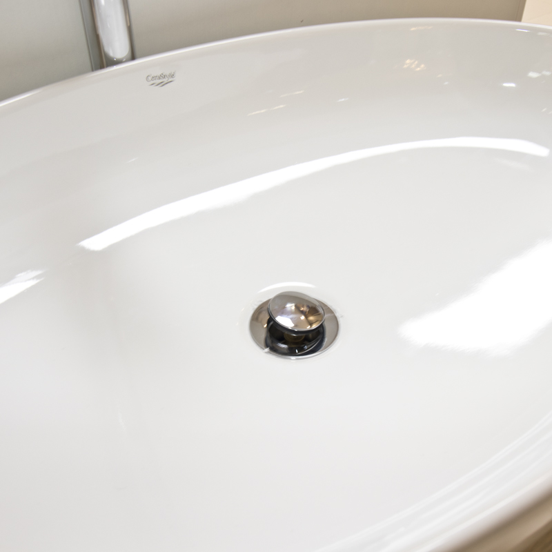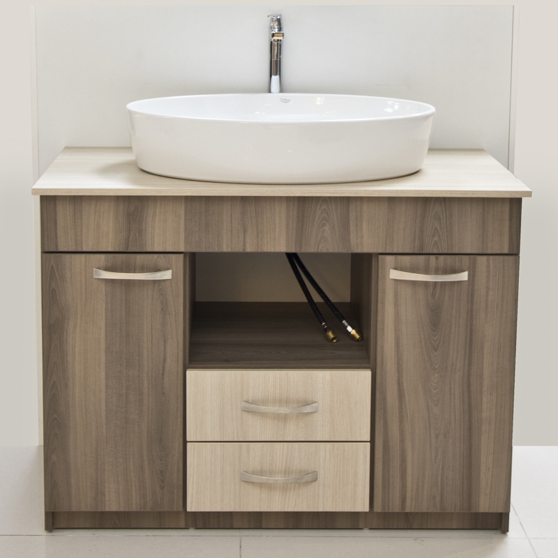Fabricado en aglomerado MUF resistente a la humedad. Lavamanos de porcelana. Grifo en acabado cromo marca Pfister.