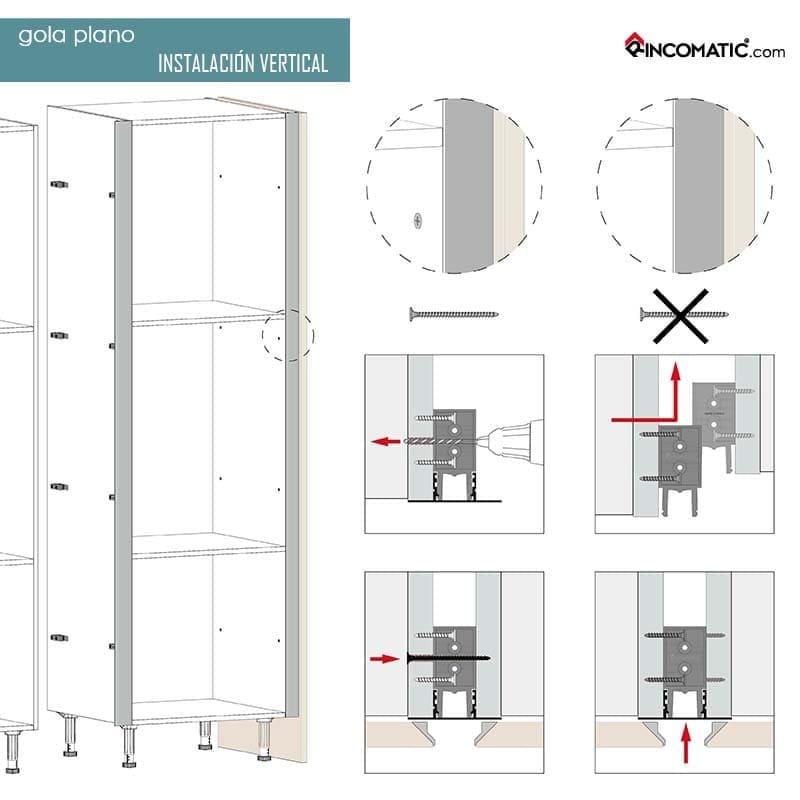 • Instalación en el módulo mediante Clip-Gola: - En posición horizontal: el Clip permite una fijación sencilla del perfil al módulo y a la encimera, equilibrándola a su vez. - En posición vertical: el Clip actúa como espaciador entre módulos y facilita su unión.